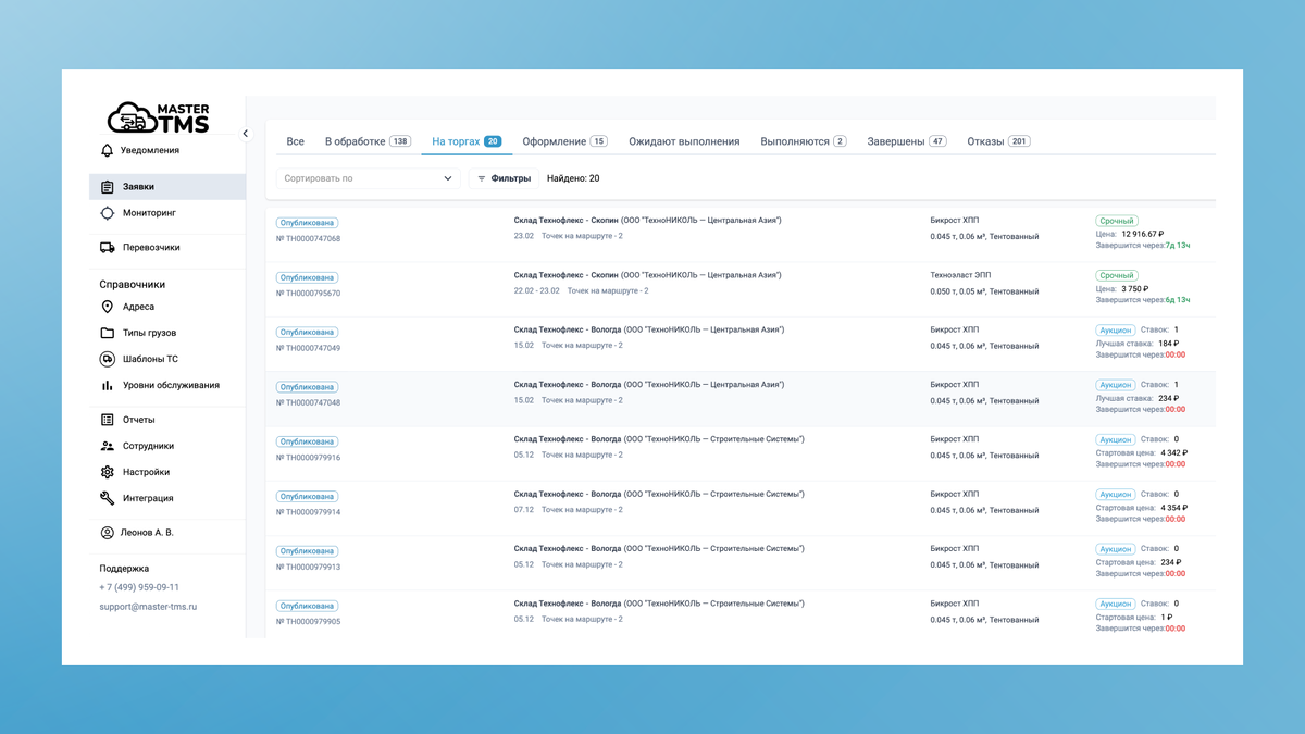ПО для логистов MasterTMS позволяет грузоотправителям проводить аукционы на понижение цены. Грузоотправитель описывает детали заказа и объявляет аукцион среди тех перевозчиков, с которыми имеет контракты. Каждый из грузоперевозчиков предлагает минимальную цену, по которой он готов выполнить этот заказ. Заказчик выбирает подрядчика, который предложил лучшие условия.